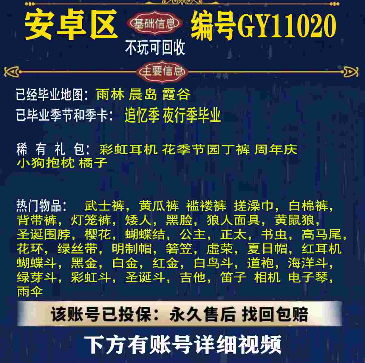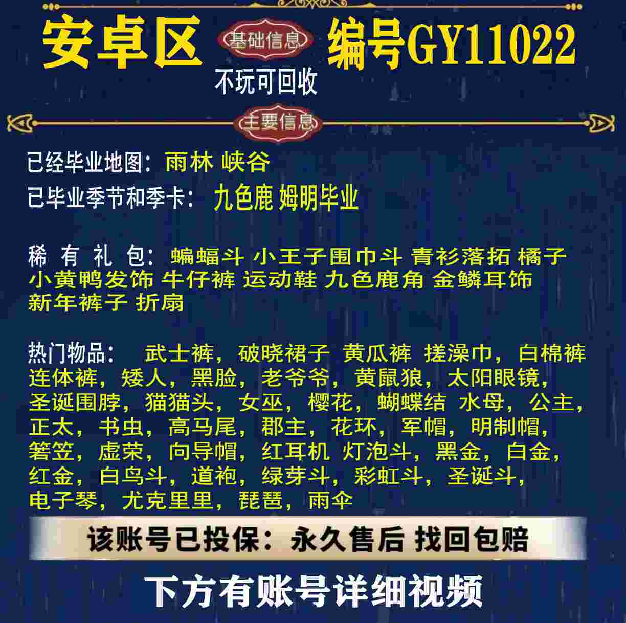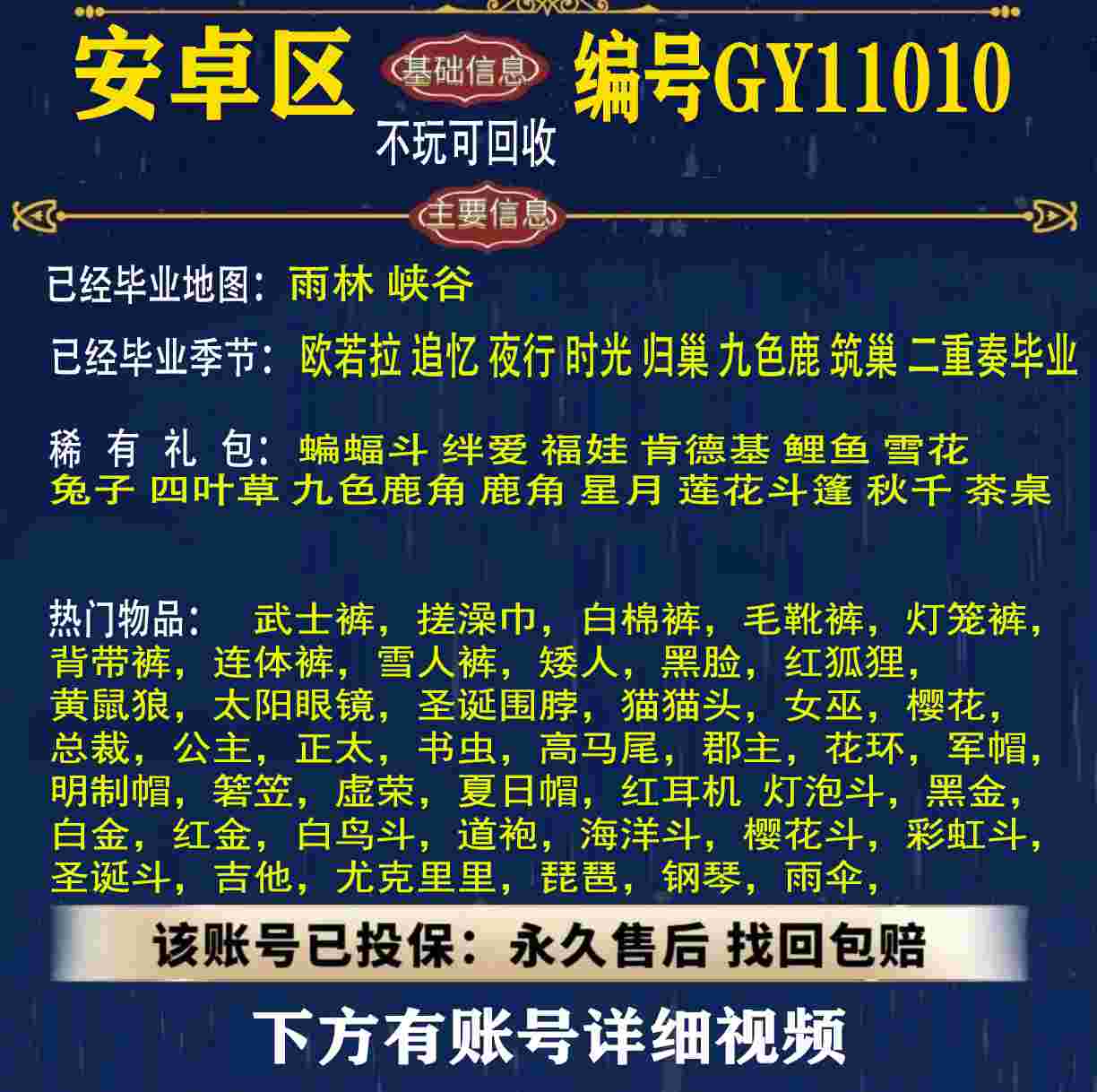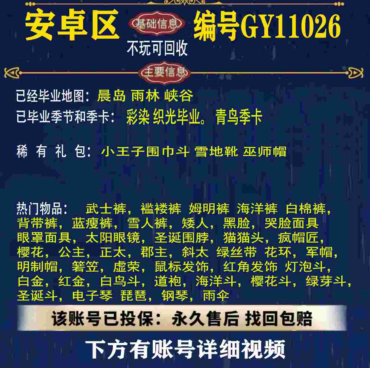 雨林 峡谷 欧若拉 追忆 夜行 时光 归巢 九色鹿 筑巢 二重奏毕业 蝙蝠斗 绊爱 福娃 肯德基 鲤鱼 雪花 兔子 四叶草 九色鹿角 鹿角 星月 莲花斗篷 秋千 茶桌 武士裤,搓澡巾,白棉裤,毛靴裤,灯笼裤,背带裤,连体裤,雪人裤,矮人,黑脸,红狐狸,黄鼠狼,太阳眼镜,圣诞围脖,猫猫头,女巫,樱花,总裁,公主,正太,书虫,高马尾,郡主,花环,军帽,明制帽,箬笠,虚荣,夏日帽,红耳机 灯泡斗,黑金,白金,红金,白鸟斗,道袍,海洋斗,樱花斗,彩虹斗,圣诞斗,吉他,尤克里里,琵琶,钢琴,雨伞,GY11010