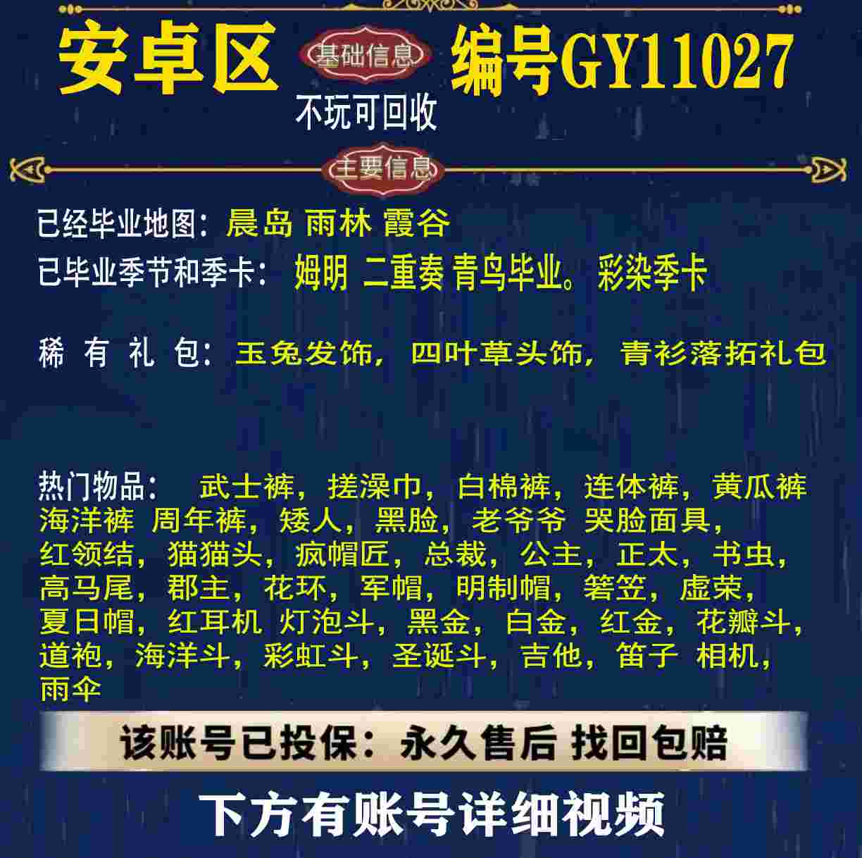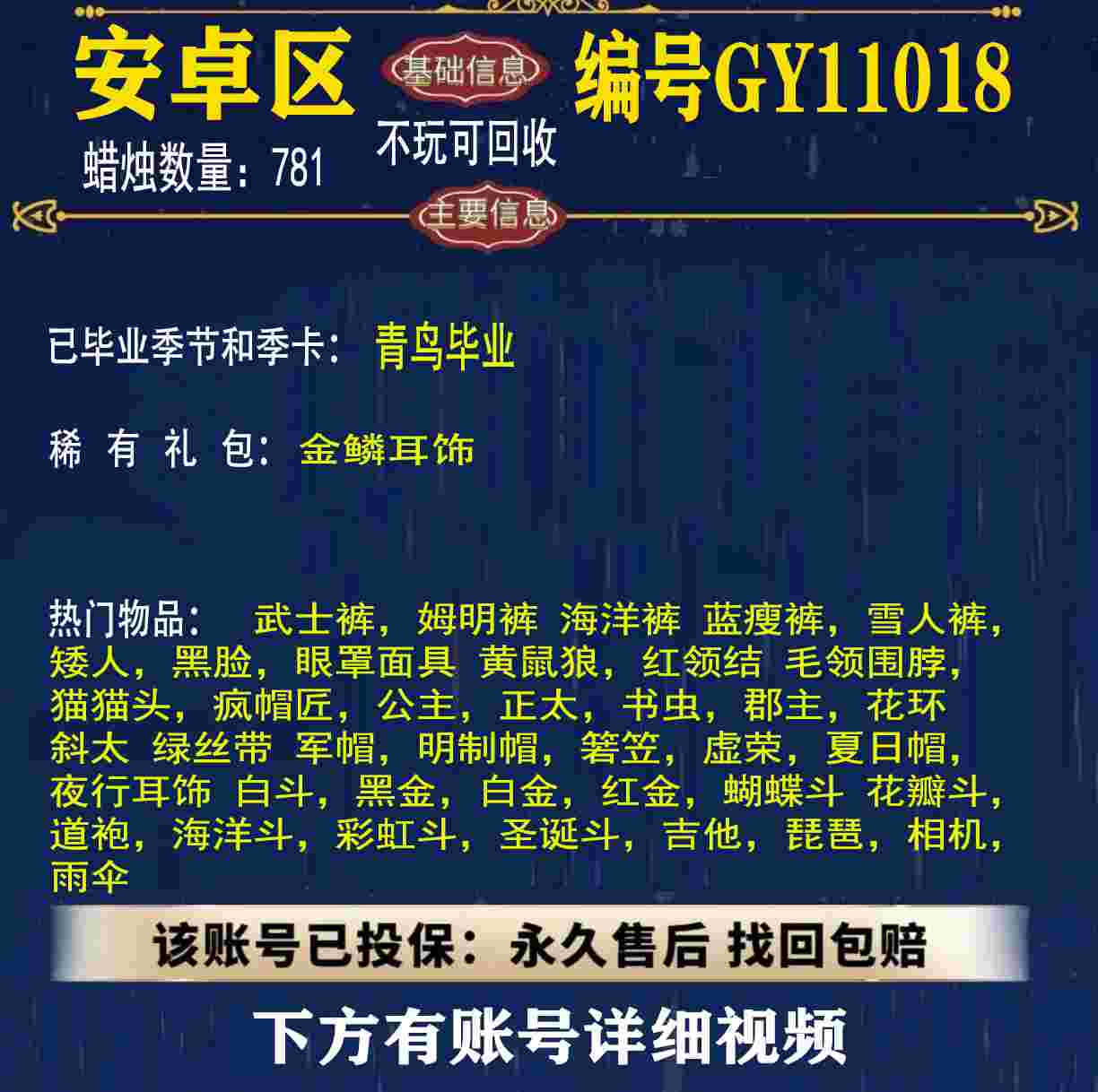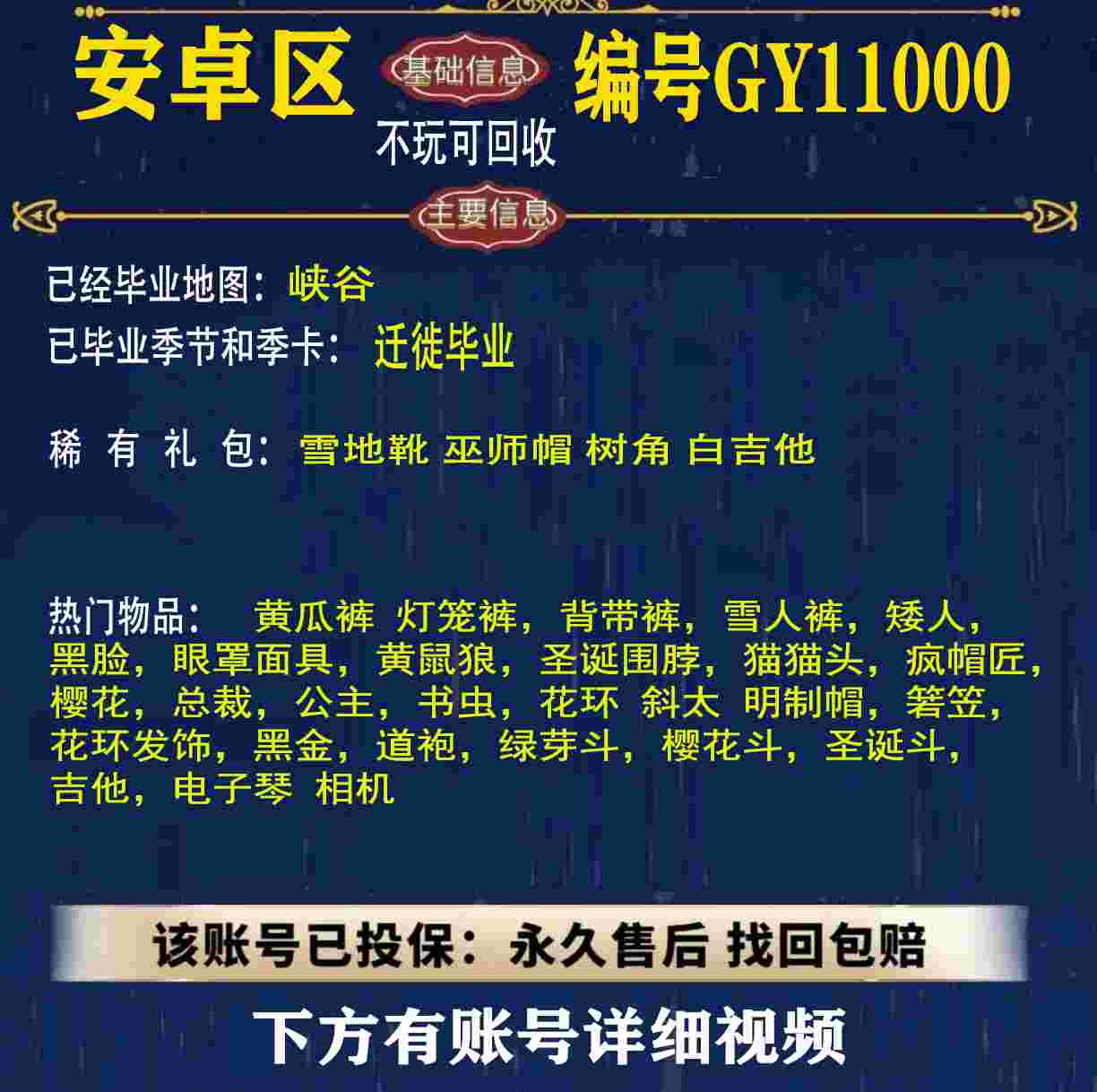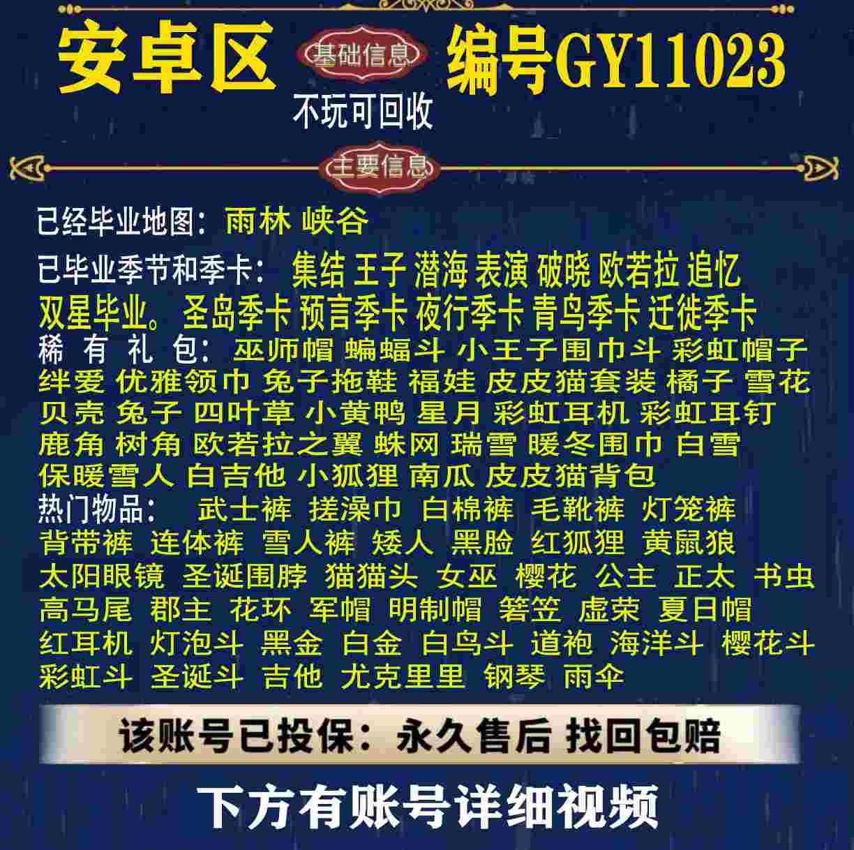 雨林 峡谷 欧若拉 追忆 夜行 时光 归巢 九色鹿 筑巢 二重奏毕业 蝙蝠斗 绊爱 福娃 肯德基 鲤鱼 雪花 兔子 四叶草 九色鹿角 鹿角 星月 莲花斗篷 秋千 茶桌 武士裤,搓澡巾,白棉裤,毛靴裤,灯笼裤,背带裤,连体裤,雪人裤,矮人,黑脸,红狐狸,黄鼠狼,太阳眼镜,圣诞围脖,猫猫头,女巫,樱花,总裁,公主,正太,书虫,高马尾,郡主,花环,军帽,明制帽,箬笠,虚荣,夏日帽,红耳机 灯泡斗,黑金,白金,红金,白鸟斗,道袍,海洋斗,樱花斗,彩虹斗,圣诞斗,吉他,尤克里里,琵琶,钢琴,雨伞,GY11010