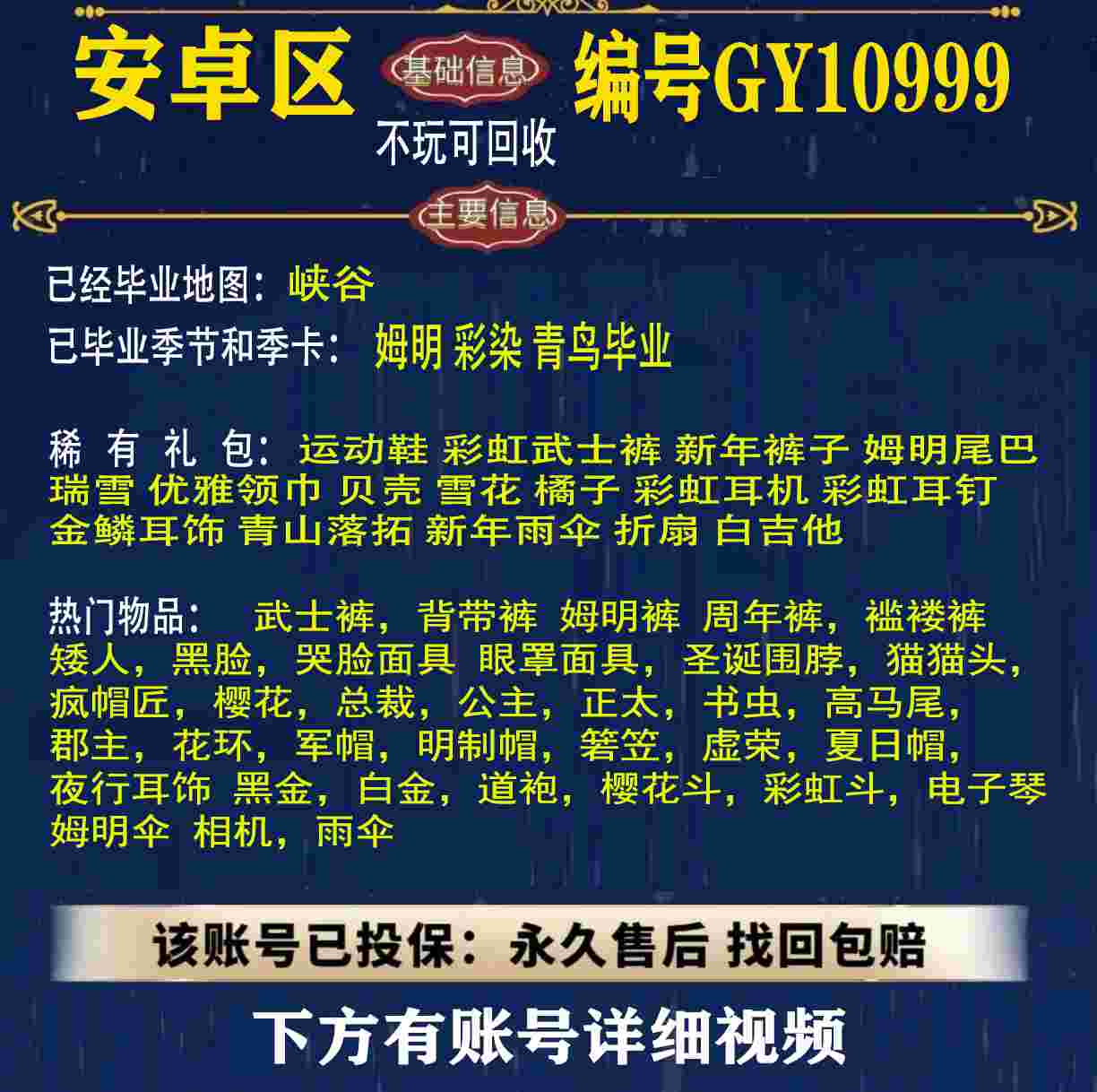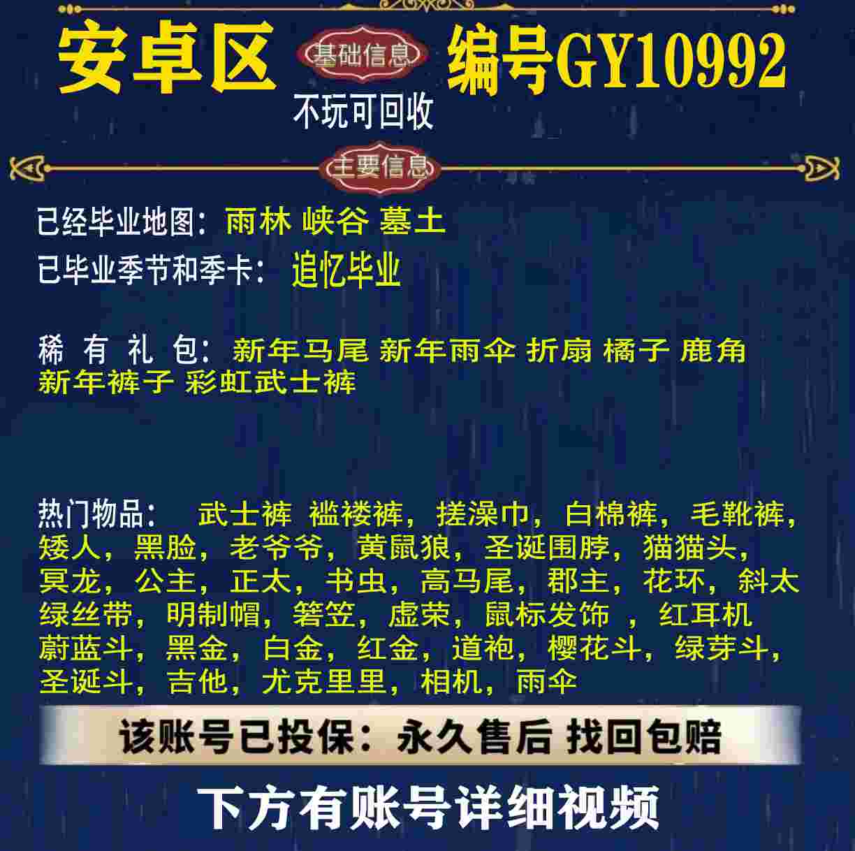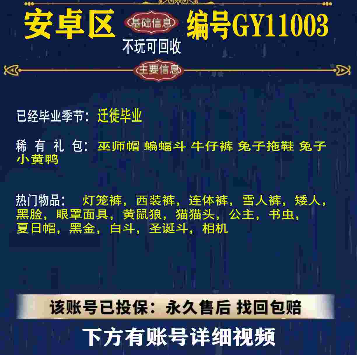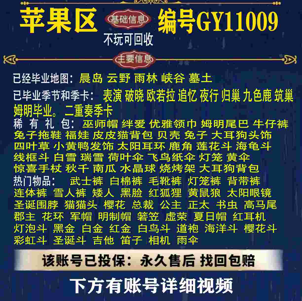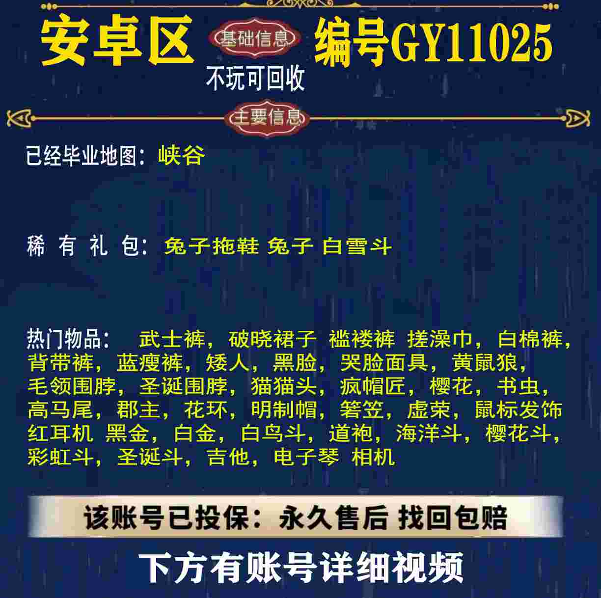 雨林 峡谷 欧若拉 追忆 夜行 时光 归巢 九色鹿 筑巢 二重奏毕业 蝙蝠斗 绊爱 福娃 肯德基 鲤鱼 雪花 兔子 四叶草 九色鹿角 鹿角 星月 莲花斗篷 秋千 茶桌 武士裤,搓澡巾,白棉裤,毛靴裤,灯笼裤,背带裤,连体裤,雪人裤,矮人,黑脸,红狐狸,黄鼠狼,太阳眼镜,圣诞围脖,猫猫头,女巫,樱花,总裁,公主,正太,书虫,高马尾,郡主,花环,军帽,明制帽,箬笠,虚荣,夏日帽,红耳机 灯泡斗,黑金,白金,红金,白鸟斗,道袍,海洋斗,樱花斗,彩虹斗,圣诞斗,吉他,尤克里里,琵琶,钢琴,雨伞,GY11010