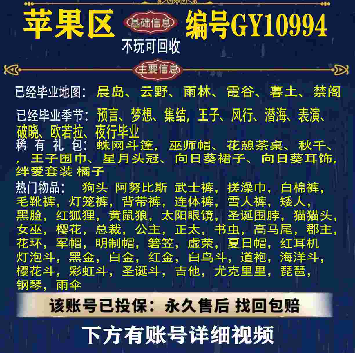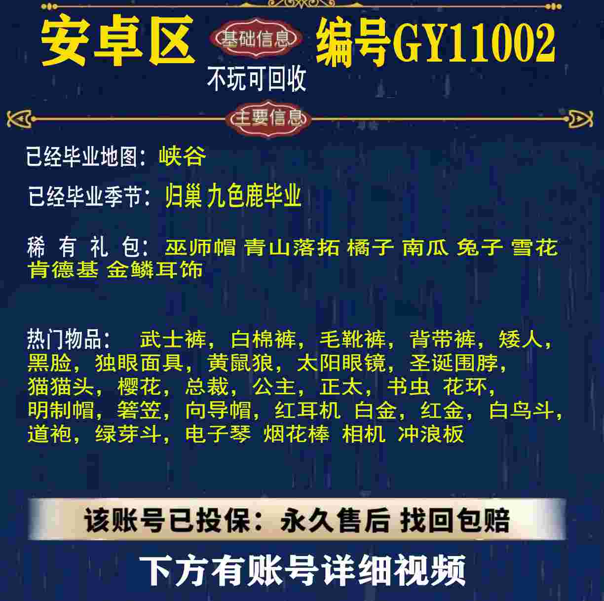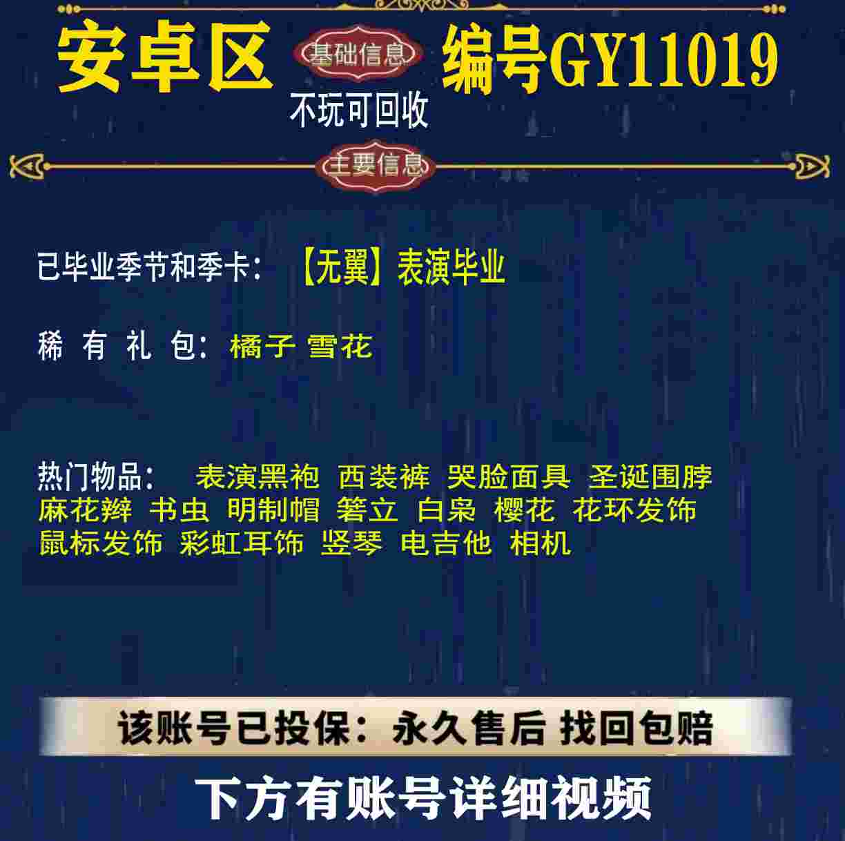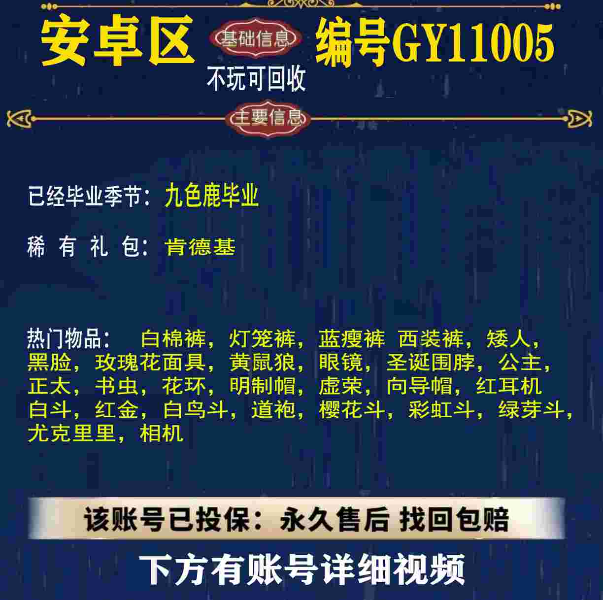 雨林 峡谷 欧若拉 追忆 夜行 时光 归巢 九色鹿 筑巢 二重奏毕业 蝙蝠斗 绊爱 福娃 肯德基 鲤鱼 雪花 兔子 四叶草 九色鹿角 鹿角 星月 莲花斗篷 秋千 茶桌 武士裤,搓澡巾,白棉裤,毛靴裤,灯笼裤,背带裤,连体裤,雪人裤,矮人,黑脸,红狐狸,黄鼠狼,太阳眼镜,圣诞围脖,猫猫头,女巫,樱花,总裁,公主,正太,书虫,高马尾,郡主,花环,军帽,明制帽,箬笠,虚荣,夏日帽,红耳机 灯泡斗,黑金,白金,红金,白鸟斗,道袍,海洋斗,樱花斗,彩虹斗,圣诞斗,吉他,尤克里里,琵琶,钢琴,雨伞,GY11010